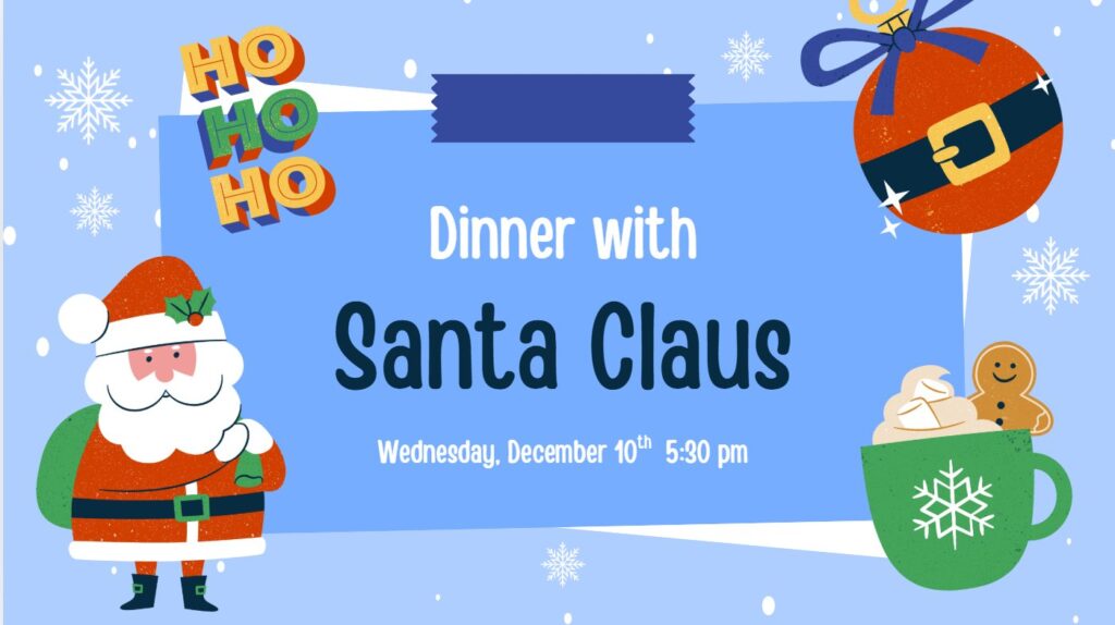 - Dinner with Santa – Wednesday, 12/10 at 5:30pm